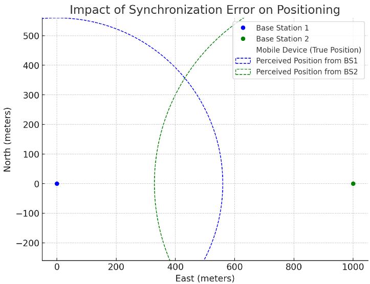 In an optimal scenario where all base stations exhibit similar timing errors, these discrepancies can sometimes negate each other, minimizing the impact on positioning accuracy. Conversely, if base stations have timing errors of opposite signs or varying magnitudes, the resultant positioning error increases, sometimes exponentially.