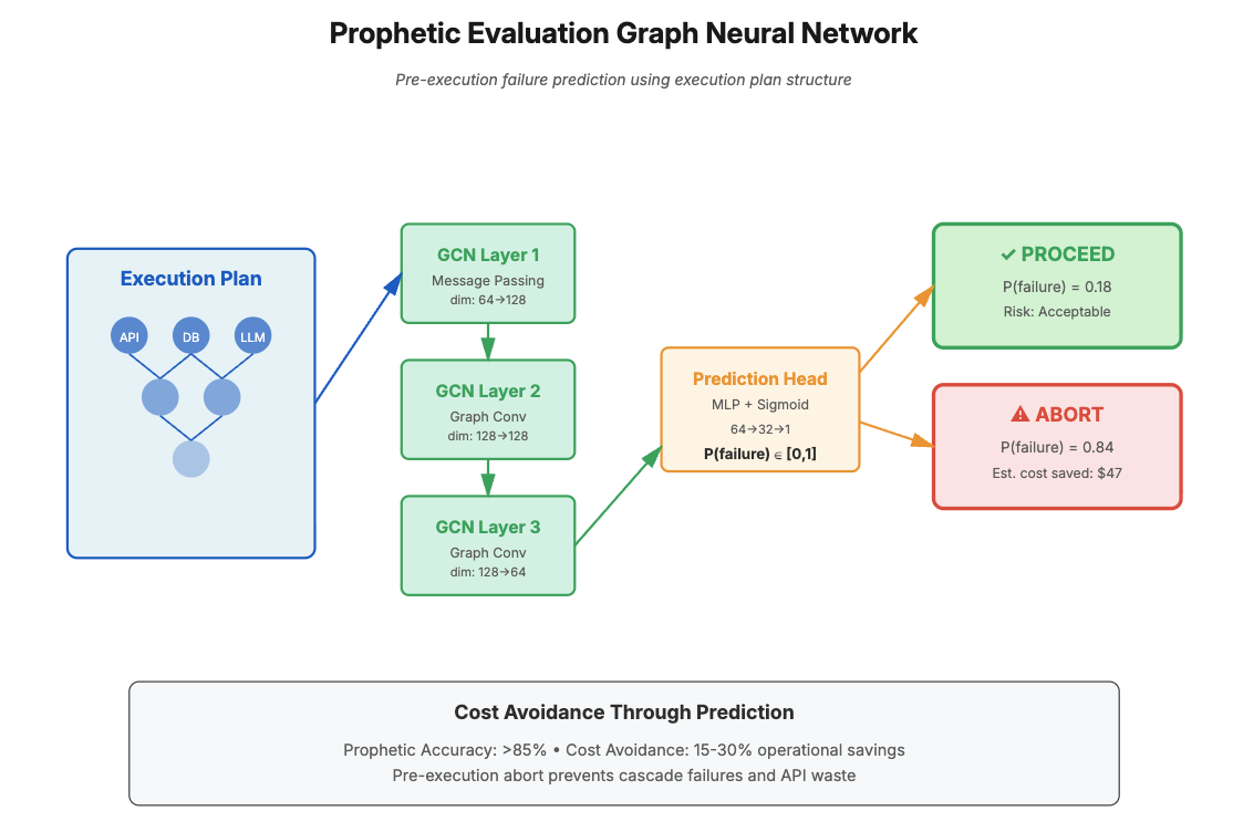 - Prophetic Evaluation Graphs: GNN-based pre-execution failure prediction, preventing 15-30% of operational costs