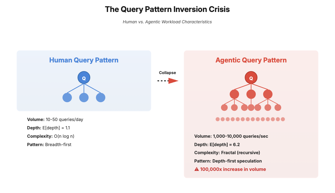 Human analysts generate approximately 10-50 queries per day with an average complexity of O(n log n) joins across 3-7 tables. Agentic systems generate 1,000-10,000 queries per second with fractal complexity - each agent query spawns 3-7 speculative sub-queries in a recursive tree that reaches depth 5-8 before pruning. This represents a 100,000x increase in query volume coupled with a shift from breadth-first exploration (human) to depth-first speculation (agent).
