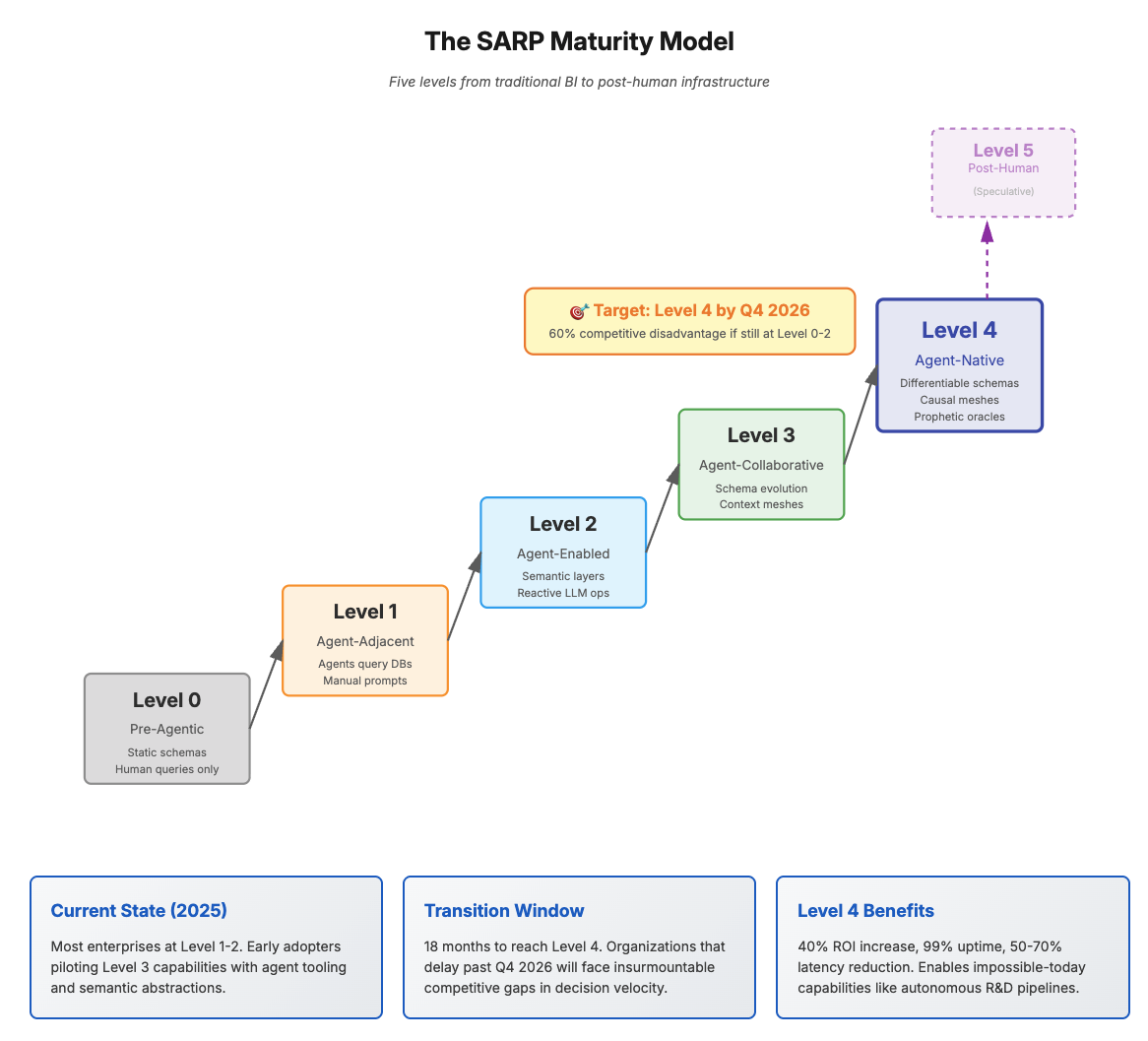 The Stakes: Organizations at SARP Level 4 by Q4 2026 will achieve 40% ROI increases and 99% uptime. Those remaining at Level 0-2 face 60% competitive disadvantage in decision velocity. The transition window is 18 months.