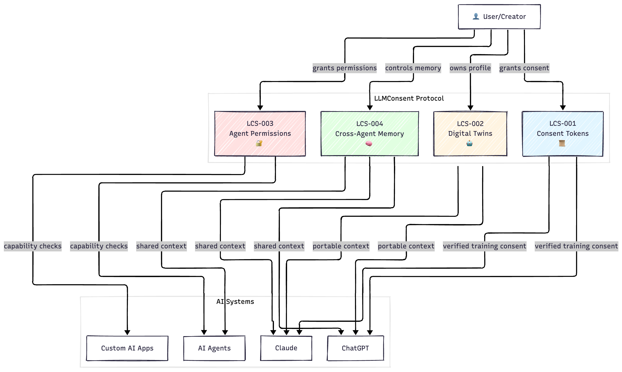 The Problem: AI has no consent layer. Creators can’t control how their data is used for training. Users can’t take their AI profiles between systems. Agents have unrestricted access with no permission framework. I wrote four open standards (LLMConsent) to fix this - think HTTP for AI consent. They’re on GitHub , they need work, and I need your help building them. This isn’t a product pitch, it’s an RFC.
