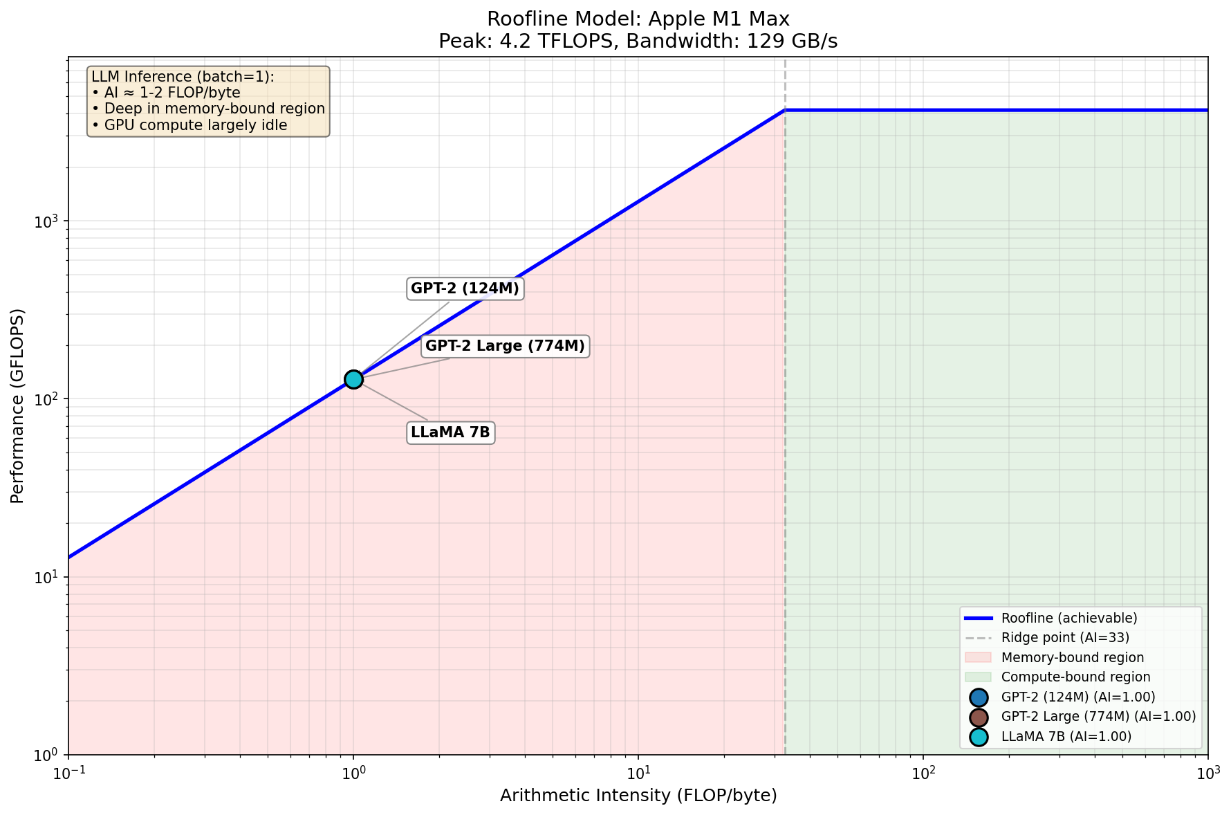 - Ridge point: ~30-150 FLOP/byte (depends on hardware)