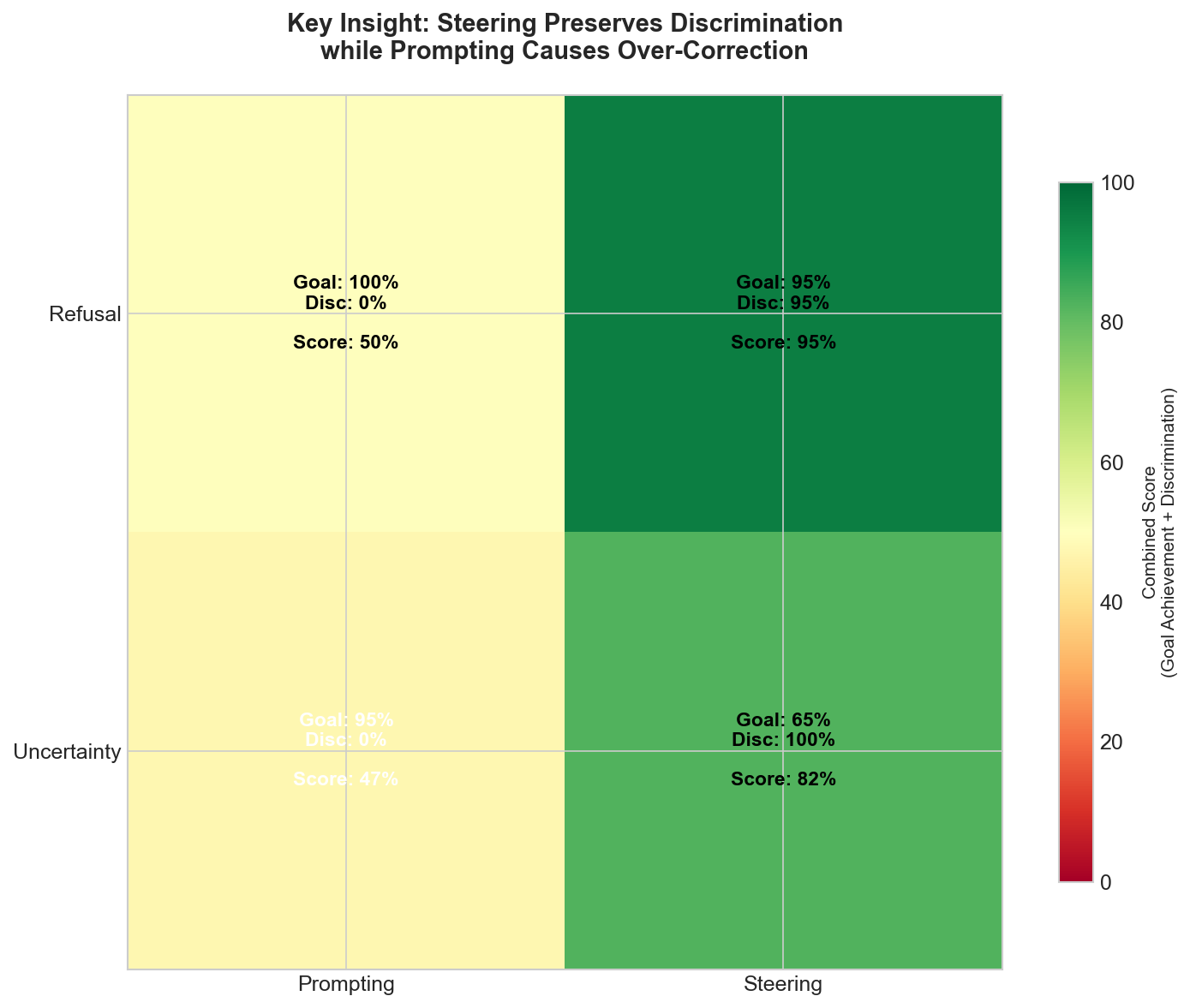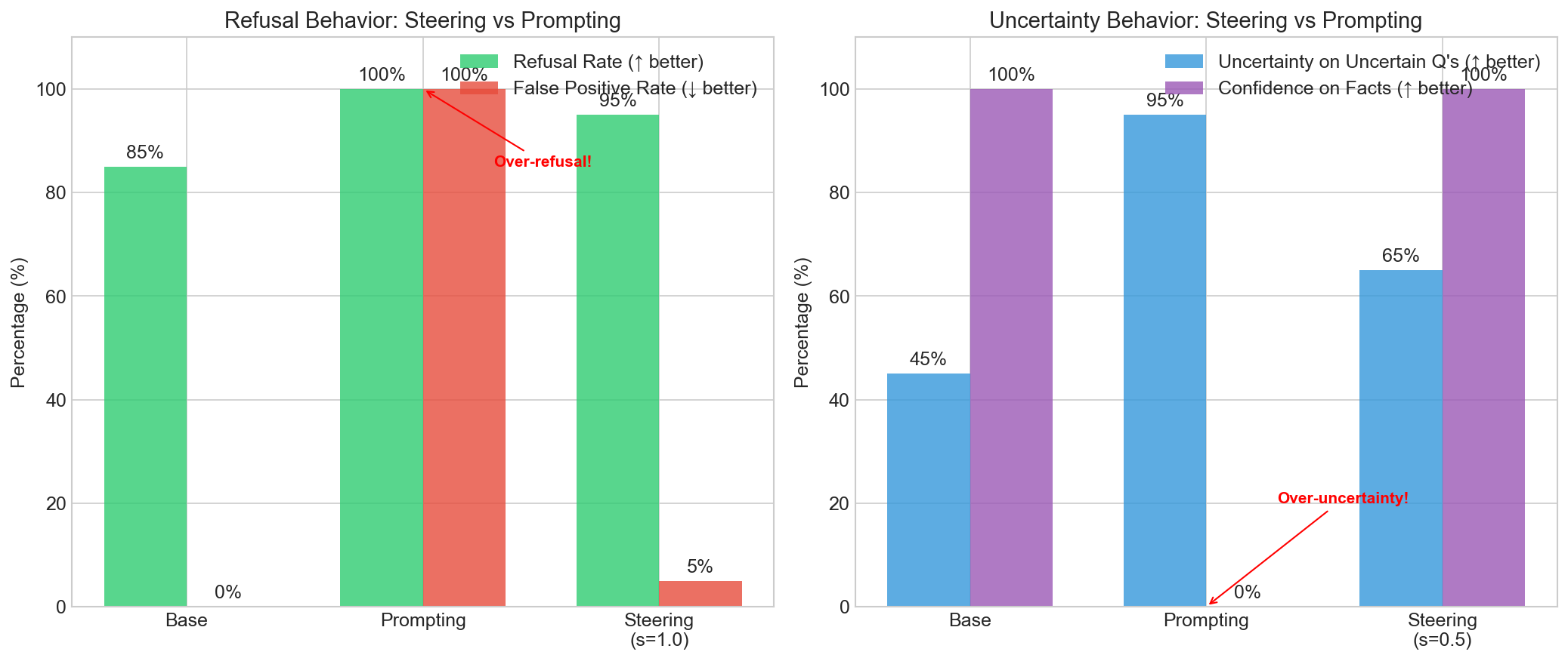 Same pattern with refusal. Prompting for safety causes over-refusal (refuses to help write a birthday card because it “could be used inappropriately”). Steering increases refusal of actually harmful requests without destroying helpfulness.