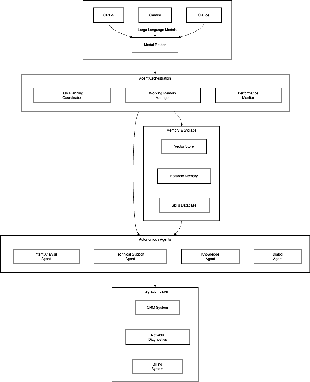 Our autonomous agent system comprises multiple specialized agents, each powered by LLMs but trained for specific tasks. The system architecture is designed to handle complex customer queries while maintaining context and ensuring consistent, accurate responses.