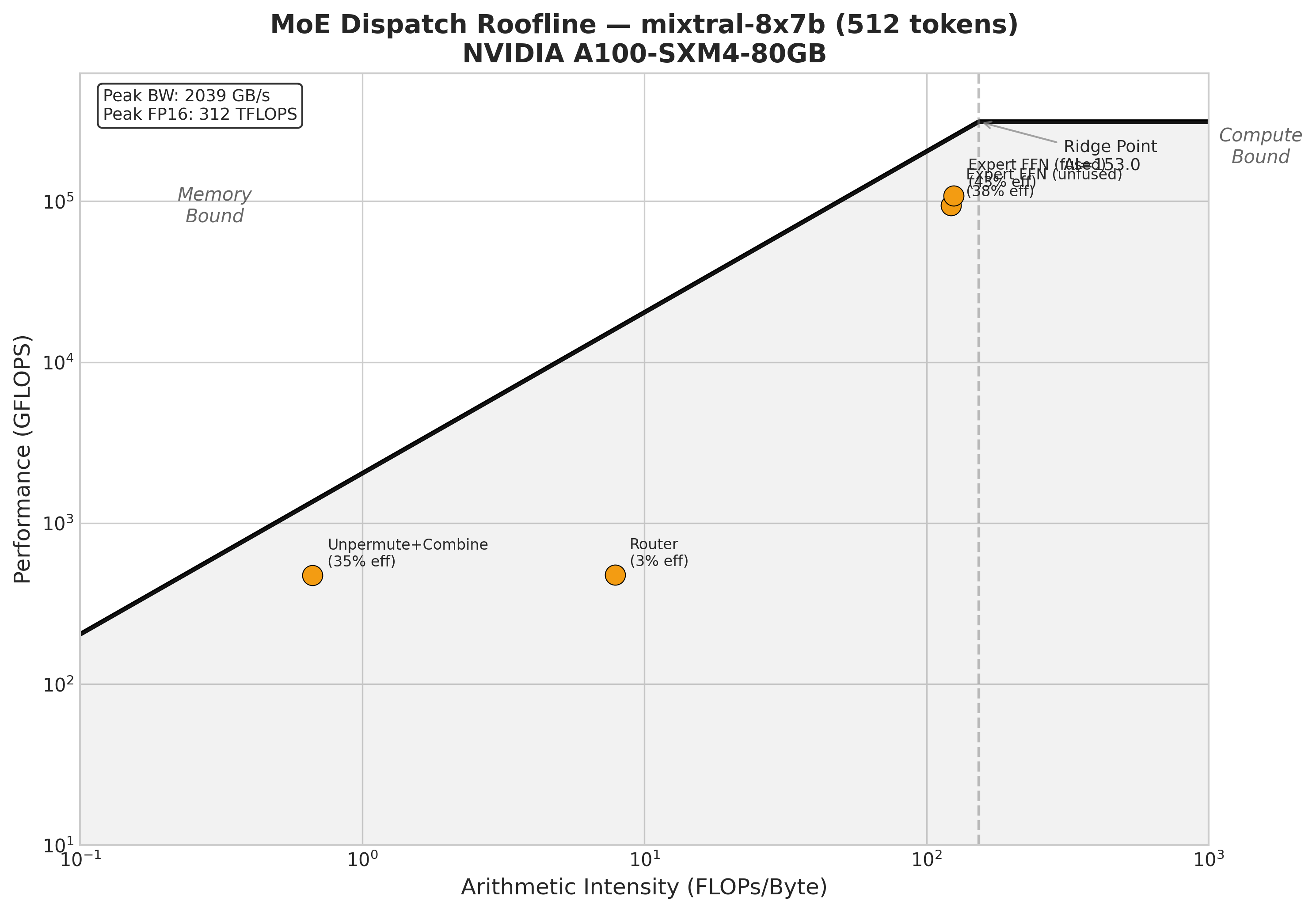 DeepSeek-V3 tells a different story. With 256 experts and tiny per-expert batches, even the expert FFN is memory-bound, sitting on the bandwidth slope, not the compute plateau. The unpermute kernel actually hits 54% of peak bandwidth, which is decent for an irregular scatter operation.